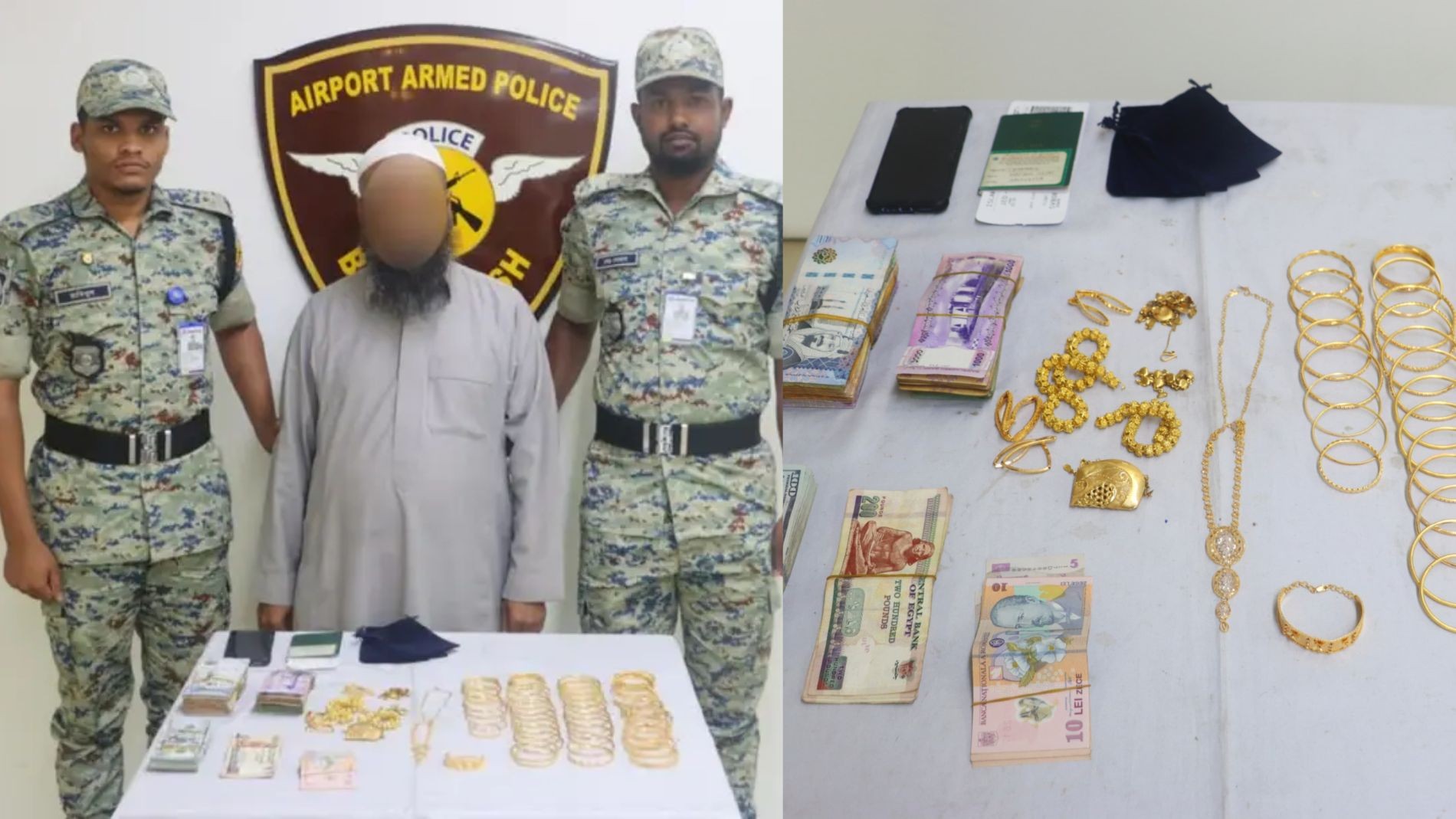 পরে তল্লাশিতে তার কাছ থেকে ৪৯৯.১ গ্রাম ২১ ক্যারেট স্বর্ণালংকার উদ্ধার করা হয়, যার আনুমানিক মূল্য প্রায় ৮৩ লাখ ৮৪ হাজার টাকা। পাশাপাশি জব্দ করা হয় ৯ হাজার মার্কিন ডলার, ৮ হাজার ৫০১ সৌদি রিয়াল, ১ হাজার ৮০০ মিসরীয় পাউন্ড, ১৫০ রোমানিয়ান লিউ এবং ৮০ হাজার ১১৭ টাকা।
