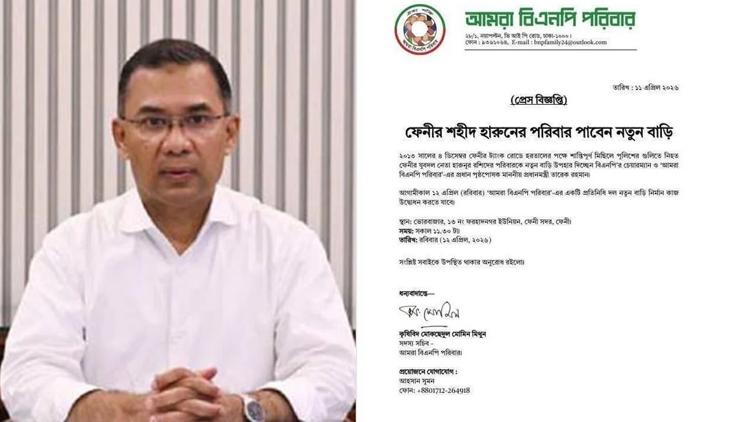 রোববার (১২ এপ্রিল) ‘আমরা বিএনপি পরিবার’-এর একটি প্রতিনিধিদল নতুন বাড়ি নির্মাণকাজের উদ্বোধন করবেন। আমরা বিএনপি পরিবার সদস্যসচিব কৃষিবিদ মোকছেদুল মোমিন মিথুন সাক্ষরিত এক সংবাদ বিজ্ঞপ্তিতে এ কথা জানানো হয়।জানা যায়, ফেনী সদর উপজেলার ফরহাদনগর ইউনিয়নের ভোরবাজারের যুবদল নেতা হারুনুর রশিদ ওই বছরের ৪ ডিসেম্বর হরতালের পক্ষে মিছিল করতে গিয়ে পুলিশের গুলিতে প্রাণ হারান।