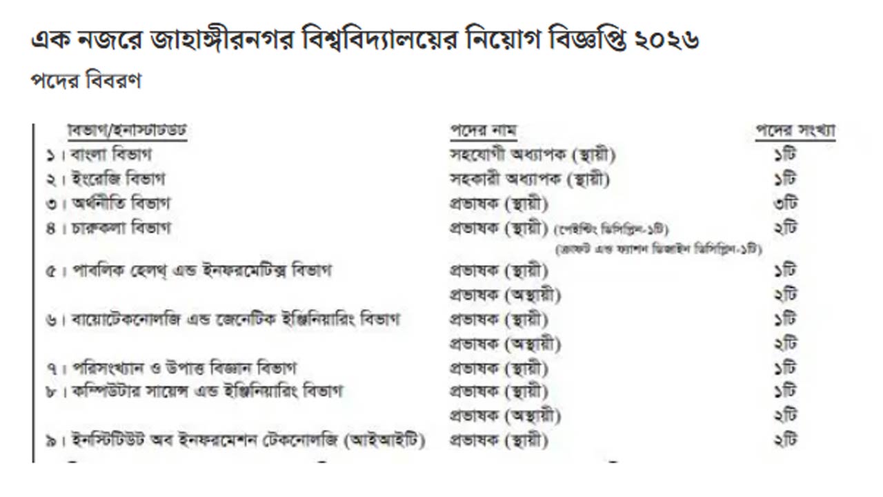 এক নজরে জাহাঙ্গীরনগর বিশ্ববিদ্যালয়ের নিয়োগ বিজ্ঞপ্তি ২০২৬