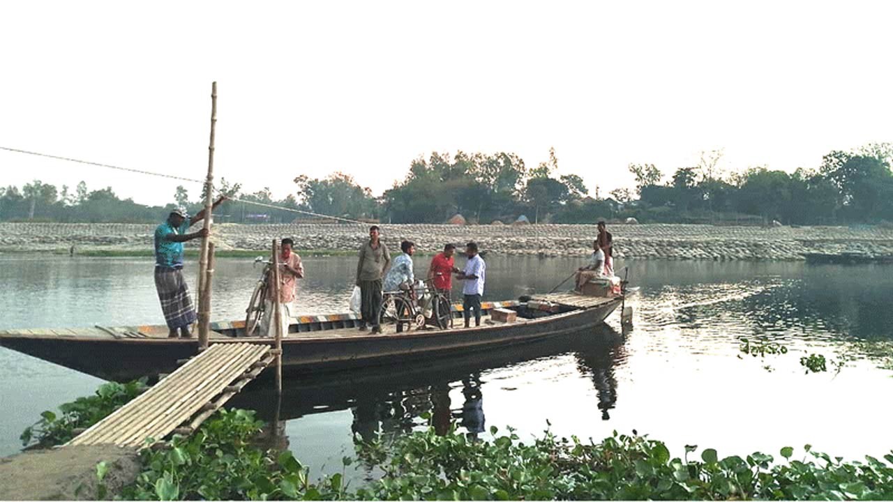 সিরাজগঞ্জের উল্লাপাড়ায় করতোয়ার বেতবাড়িঘাটে রশি টেনে নৌকা পারাপার