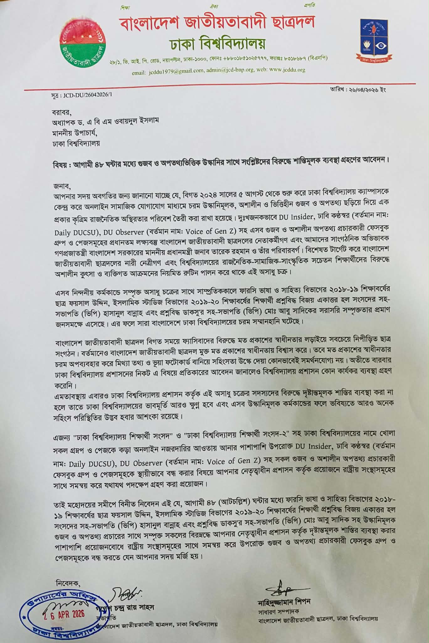 আবেদনে উল্লেখ করা হয়, ২০২৪ সালের ৫ আগস্ট থেকে সামাজিক যোগাযোগমাধ্যমভিত্তিক বিভিন্ন পেজ ও গ্রুপের মাধ্যমে ধারাবাহিকভাবে অপতথ্য, কুৎসা, অশালীন কনটেন্ট ও উস্কানিমূলক পোস্ট ছড়িয়ে ঢাকা বিশ্ববিদ্যালয়কেন্দ্রিক একটি অস্থির পরিবেশ তৈরির চেষ্টা চলছে। বিশেষ করে DU Insider, ঢাবি কণ্ঠস্বর (বর্তমানে Daily DUCSU) এবং DU Observer (বর্তমানে Voice of Gen Z) নামের পেজগুলোকে এ ধরনের কর্মকাণ্ডের সঙ্গে যুক্ত বলে অভিযোগ করা হয়। ছাত্রদলের দাবি, এসব অপপ্রচারের প্রধান লক্ষ্য তাদের নেতাকর্মী, বিশেষ করে নারী নেত্রী এবং রাজনৈতিক-সামাজিকভাবে সক্রিয় শিক্ষার্থীরা। একই সঙ্গে সংগঠনটির শীর্ষ নেতৃত্ব ও তাদের পরিবারের বিরুদ্ধেও কুৎসা রটানো হচ্ছে বলে অভিযোগে বলা হয়। আবেদনে ফারসি ভাষা ও সাহিত্য বিভাগের শিক্ষার্থী ফয়সাল উদ্দিন, ইসলামিক স্টাডিজ বিভাগের শিক্ষার্থী ও বিজয় একাত্তর হলের ভিপি হাসানুল বান্নাহ এবং ডাকসু ভিপি সাদিক কায়েমের সরাসরি সম্পৃক্ততার অভিযোগ তুলে তাদের বিরুদ্ধে দ্রুত ব্যবস্থা নেওয়ার আহ্বান জানানো হয়।