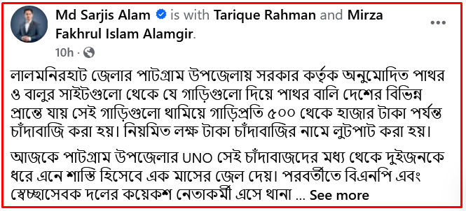 সারজিস লেখেন, লালমনিরহাট জেলার পাটগ্রাম উপজেলায় সরকার কর্তৃক অনুমোদিত পাথর ও বালুর সাইটগুলো থেকে যে গাড়িগুলো দিয়ে পাথর বালি দেশের বিভিন্ন প্রান্তে যায় সেই গাড়িগুলো থামিয়ে গাড়িপ্রতি ৫০০ থেকে হাজার টাকা পর্যন্ত চাঁদাবাজি করা হয়। নিয়মিত লক্ষ টাকা চাঁদাবাজির নামে লুটপাট করা হয়।