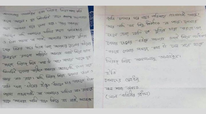খামের ভেতরের চিঠিতে লেখা ছিল,তোমার বাড়িতে যথেষ্ট পরিমাণ স্বর্ণালংকার ও টাকা-পয়সা আছে। যদি তা না পাই, তোমার ছেলে ও নাতিকে দুনিয়া ছাড়া করব এবং ছেলের বউকে তোমার সামনে আমরা গণধর্ষণ করব।