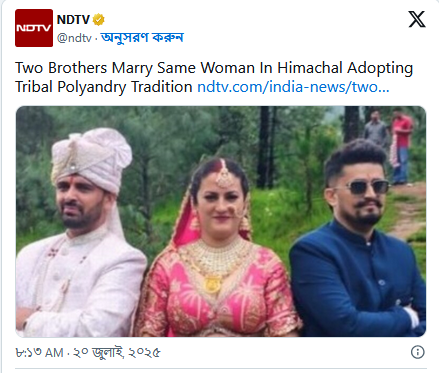 প্রতিবেদনে বলা হয়েছে, হিমাচল প্রদেশের সিরমৌর জেলার শিল্লাই গ্রামের এক ঐতিহ্যবাহী বিয়েতে একই নারীকে বিয়ে করেছেন দুই ভাই। তাদের নাম প্রদীপ ও কপিল নেগি। পাত্রীর নাম সুনীতা চৌহান এবং শত শত মানুষের উপস্থিতিতে হট্টি উপজাতির বহু পুরোনো বহুগামিতা প্রথা মেনে এ বিয়ে হয়েছে।মূলত তিন দিনব্যাপী এই বিয়ের উৎসব শুরু হয়েছিল গত ১২ জুলাই থেকে। কনে সুনীতা কুনহাট গ্রামের বাসিন্দা। তিনি জানান, “আমি এই প্রথা সম্পর্কে জানতাম এবং নিজের ইচ্ছাতেই এই সিদ্ধান্ত নিয়েছি। এটি আমাদের মধ্যে গড়ে ওঠা সম্পর্কের প্রতি আমার সম্মান।”অন্যদিকে প্রদীপ বলেন, “এই বিয়ে নিয়ে আমরা গর্বিত। এটা গোপনে নয়, খোলামেলাভাবেই করেছি। সিদ্ধান্তটা ছিল পারিবারিক ও সম্মতিপূর্ণ।”