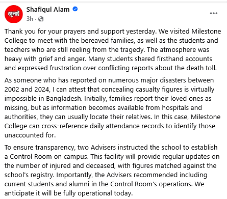 উত্তরা মাইলস্টোন স্কুল অ্যান্ড কলেজে বিমান বিধ্বস্তের ঘটনায় আহত ও নিহতদের তথ্যের স্বচ্ছতার জন্য স্কুলে একটি নিয়ন্ত্রণ কক্ষ চালুর কথা জানিয়েছেন প্রধান উপদেষ্টার প্রেস সচিব শফিকুল আলম।