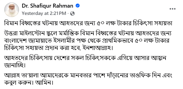 মঙ্গলবার (২২ জুলাই) নিজের ভেরিফায়েড ফেসবুক পেজে এ ঘোষণা দেন জামায়াতে ইসলামীর আমির ডা. শফিকুর রহমান। তিনি বলেন, ‘আমরা এ হৃদয়বিদারক দুর্ঘটনায় আহতদের চিকিৎসা সহায়তায় প্রাথমিকভাবে ৫০ লাখ টাকা বরাদ্দ করেছি, ইনশাআল্লাহ।’ তিনি দেশের সব চিকিৎসককে এ মানবিক সংকটে এগিয়ে আসার আহ্বান জানানো হয়।