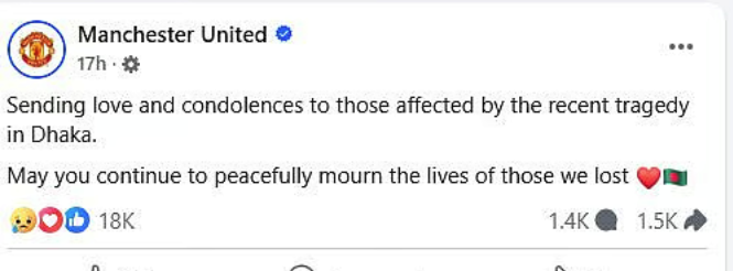 মাইলস্টোন ট্র্যাজেডি : বার্সা’র পর ম্যানচেস্টার ইউনাইটেডের শোকবার্তা
