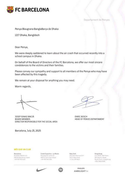 এর আগে একই ঘটনায় বাংলাদেশে বার্সেলোনার অফিশিয়াল সমর্থকগোষ্ঠী ‘পেনিয়া ব্লুগ্রানা বাংলাবার্সা’কে পাঠানো চিঠিতে কাতালান ক্লাবটি শোক প্রকাশ করে। সেখানে পাঠানো বিবৃতিতে বার্সা জানায়, ‘সম্প্রতি ঢাকার একটি স্কুলে ঘটে যাওয়া এক মর্মান্তিক বিমান বিধ্বস্ত হওয়ার ঘটনায় আমরা গভীরভাবে শোকাহত। বার্সেলোনার পরিচালনা পর্ষদের পক্ষ থেকে আমরা যারা ক্ষতিগ্রস্ত তাদের প্রতি এবং তাদের পরিবারের প্রতি আন্তরিক সমবেদনা জ্ঞাপন করছি।’
