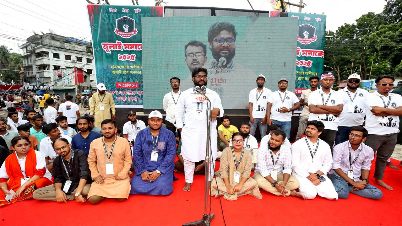 সেই গণঅভ্যুত্থানের আকাঙ্খায় এই বাংলাদেশ চলতে হবে। যারা চাঁদাবাজি ও দখলদারিত্ব করছেন, করে যান কিন্তু মনে রাখছেন এর শেষ মাথায় বাংলাদেশের ছাত্ররা দাঁড়িয়ে আছে। ছাত্রদের এই শক্তিকে উপেক্ষা করবার মত দুঃসাহস দেখাবেন না। গণঅভ্যুত্থানের এক বছর পার হয়ে গেছে আমরা এখনও জুলাই সনদ দেখিনি। আমরা শেখ মুজিবের ফ্যাসিবাদী সংবিধানকে ছিঁড়ে ফেলতে বলেছিলাম, আমরা এখনও দেখছি সাংবিধানিক জটিলতার দোহায় আমাদের সামনে হাজির করা হচ্ছে।
