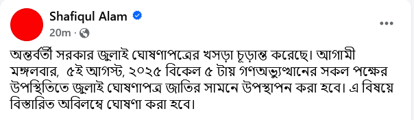 আজ শনিবার (২ আগস্ট) দুপুরে নিজের ভেরিফাইড ফেসবুক পেজে এক পোস্টের মাধ্যমে বিষয়টি নিশ্চিত করেছেন তিনি। ফেসবুক পোস্টে তিনি লিখেন, অন্তর্বর্তী সরকার জুলাই ঘোষণাপত্রের খসড়া চূড়ান্ত করেছে। আগামী মঙ্গলবার, ৫ আগস্ট, ২০২৫ বিকেল ৫টায় গণঅভ্যুত্থানের সকল পক্ষের উপস্থিতিতে জুলাই ঘোষণাপত্র জাতির সামনে উপস্থাপন করা হবে। এ বিষয়ে বিস্তারিত অবিলম্বে ঘোষণা করা হবে।