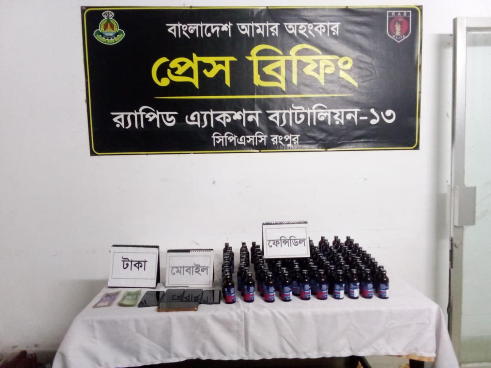 র্যাব জানায়, চলমান মাদকবিরোধী অভিযানের ধারাবাহিকতায় গতকাল মঙ্গলবার বিকেলে র্যাব-১৩, সিপিএসসি, রংপুরের আভিযানিক দল গোপন সংবাদের ভিত্তিতে লালমনিরহাট জেলার সদর থানার ৮ নং গুকুন্ডা ইউনিয়নের ০৯ নং ওয়ার্ডের আফজালনগর গ্রামে অভিযান পরিচালনা করে ধৃত আসামীদের সঙ্গে থাকা স্কুল ব্যাগের ভেতর থেকে ৯৭ বোতল ফেন্সিডিল ও ৩ টি মোটরসাইকেল জব্দসহ ৫ জন মাদক ব্যবসায়ী গ্রেফতার করে।