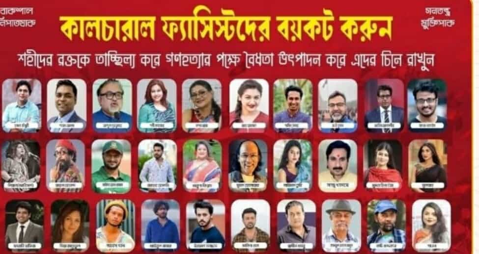 আরও পড়ুনপোস্টারে যাদের ছবি সংযুক্ত করা হয়েছে, তাদের মধ্যে রয়েছেন— গায়ক লিঙ্কন (আর্টসেল), রাহুল আনন্দ, সিয়াম (এসপি ক্রিয়েশন), জাহের আলভি, অরুণা বিশ্বাস, সুমন আনোয়ার, নাজিফা তুষি, সাজু খাদেম, মুমতাহিনা টয়া, সুনেরাহ বিনতে কামাল, ফারাবি হাফিজ, পিয়া জান্নাতুল, আরস খান, খাইরুল বাসার, ইরফান সাজ্জাদ, সাকিব খান, স্বাধীন, পারসা মেহেজাবিন, কচি খন্দকার এবং মেহের আফরোজ শাওন প্রমুখ। এ ঘটনায় সামাজিক যোগাযোগমাধ্যমে সমালোচনার ঝড় উঠেছে। অনেকেই একে সংস্কৃতির উপর আক্রমণ বলে মন্তব্য করছেন, আবার কেউ কেউ এই কর্মসূচিকে শহীদদের প্রতি অবমাননার জবাব হিসেবে সমর্থনও জানিয়েছেন।
