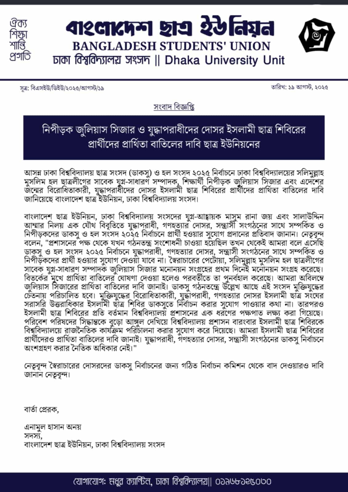 মঙ্গলবার (১৯ আগস্ট) সংগঠনটির পক্ষ থেকে দেওয়া এক লিখিত বিবৃতিতে বলা হয়, সালিমুল্লাহ মুসলিম হল ছাত্রলীগের সাবেক যুগ্ম-সাধারণ সম্পাদক নিপীড়ক জুলিয়াস সিজার এবং ইসলামী ছাত্র শিবিরের প্রার্থীদের প্রার্থীতা বাতিল করতে হবে।