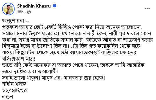 পোস্টে তিনি লেখেন, গতকাল আমার ছোট একটি ভিডিও পোস্ট করা নিয়ে অনেক আলোচনা-সমালোচনার উত্তাপ ছড়াচ্ছে। এখানে কোনো নারী কেন, নারী-পুরুষ বলে কোনো কথা না, আমি সমগ্র মানব জাতিকে সম্মান করি। কাউকে আঘাত বা আক্রমণ করার বিন্দুমাত্র ইচ্ছে বা উদ্দেশ্য ছিল না।