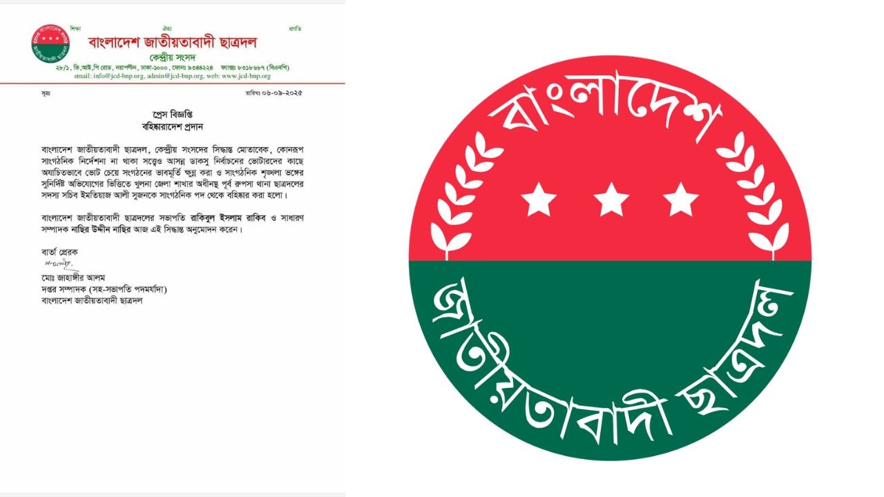 আরও পড়ুনএতে সংগঠনের ভাবমূর্তি ক্ষুণ্ন হওয়ার পাশাপাশি সাংগঠনিক শৃঙ্খলা ভঙ্গ হয়েছে। এ কারণেই তাকে দায়িত্ব থেকে অব্যাহতি দেওয়া হয়েছে। ছাত্রদলের কেন্দ্রীয় সভাপতি রাখিবুল ইসলাম রাকিব এবং সাধারণ সম্পাদক নাসির উদ্দীন নাসির এই বহিষ্কারের সিদ্ধান্ত অনুমোদন করেন।