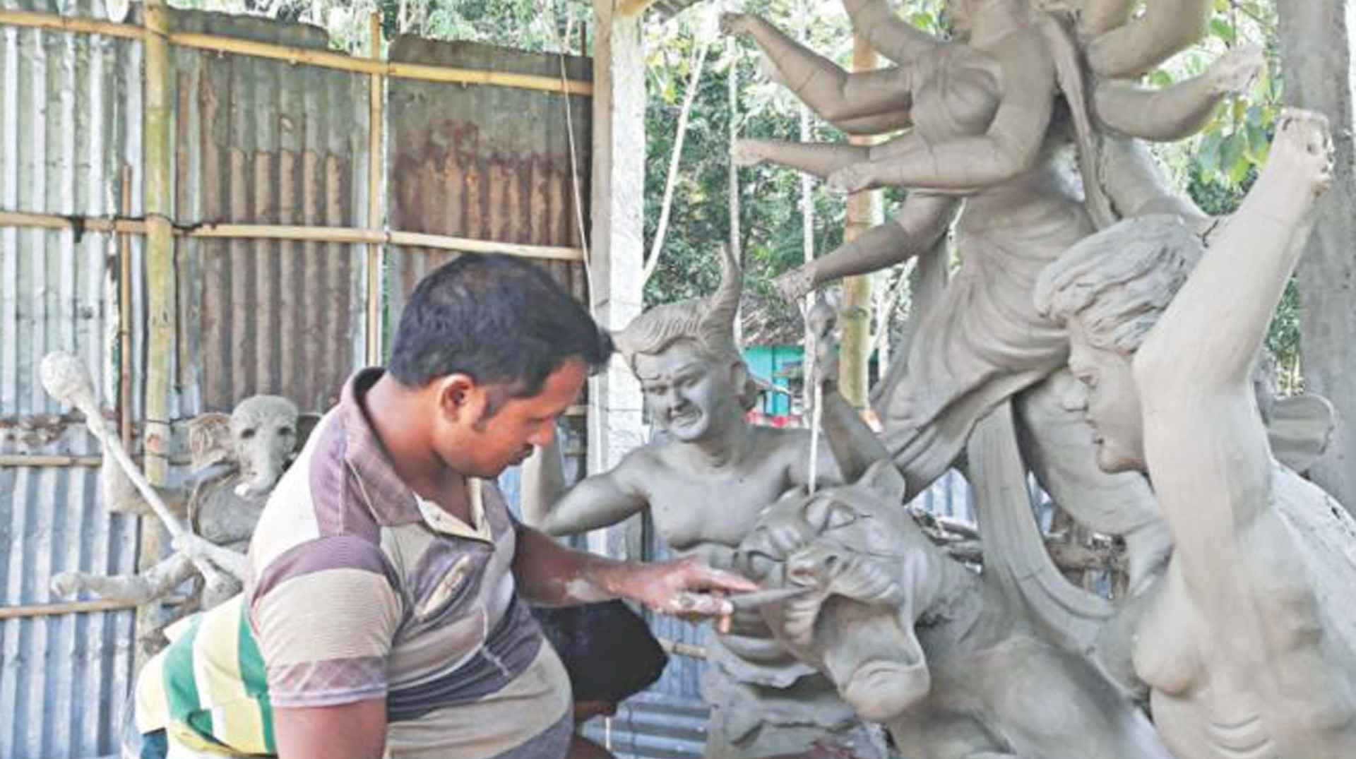 দিনাজপুরের কাহারোলে গ্রামীণ জনপদে দুর্গা প্রতিমা তৈরিতে ব্যস্ত শিল্পীরা